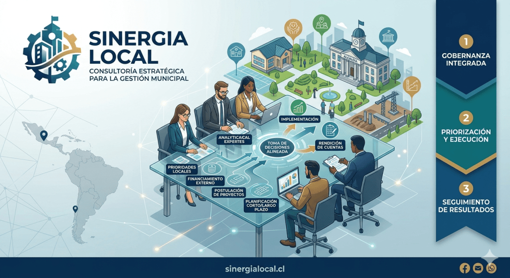 Sinergia Local ofrece una consultoría estratégica enfocada en municipios que buscan optimizar su gestión institucional. El objetivo es alinear la toma de decisiones con las prioridades locales, facilitando el acceso a financiamiento externo, la postulación de proyectos y la planificación de corto y largo plazo. Nuestro equipo cuenta con comprensión operativa de alcaldías, secretarías de planificación y concejales, lo que nos permite traducir políticas públicas en planes de acción factibles y medibles. El enfoque integra gobernanza, priorización y ejecución, con herramientas para rendición de cuentas y seguimiento de resultados. La propuesta se diferencia por operar desde dentro de las dinámicas municipales, identificando cuellos de botella, simplificando procesos y estableciendo un calendario de implementación viable. El resultado esperado es una capacidad de decisión más ágil, procesos de aprobación más eficientes y una cartera de proyectos alineada con los intereses de los ciudadanos de la comuna.